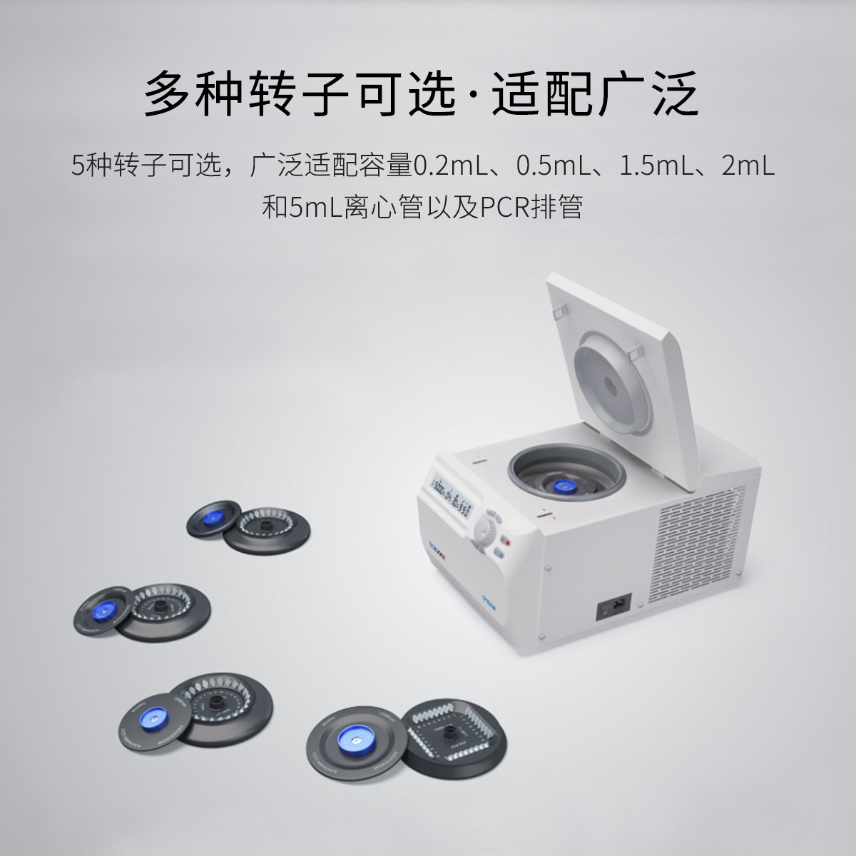· 多種轉(zhuǎn)子可選,適配廣泛:5種轉(zhuǎn)子可選,廣泛適配容量0.2ml、0.5ml、1.5ml、2ml和5ml離心管以及PCR排管